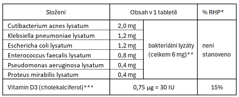Složení: sorbitol (sladidlo), isomalt (sladidlo), hořečnaté soli mastných kyselin (látka protispékavá), bakteriální lyzáty, vitamin D3 (cholekalciferol).